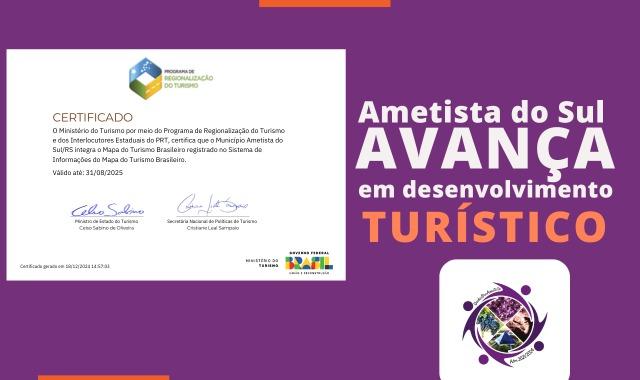 A Secretaria de Turismo de Ametista do Sul recebeu com alegria a certificação do Ministério do Turismo, quanto a integração do Município no Mapa do Turismo Brasileiro. Com isso, Ametista do Sul avança da categoria D para a categoria B.